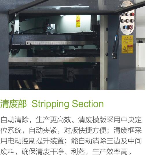 1、半清廢系統,能自動清除三邊及中間廢料,確保清廢干凈、利落,生產效率高。
